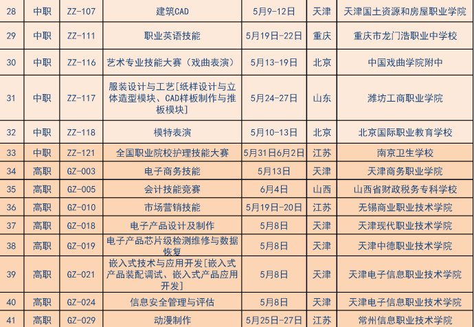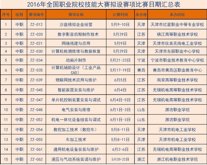 根據(jù)2016年全國職業(yè)院校技能大賽籌備工作安排,現(xiàn)將2016年全國職業(yè)院校技能大賽各賽項比賽日期(具體比賽時間以各賽項比賽通知為準(zhǔn))和承辦院校聯(lián)系方式予以公布。請各有關(guān)單位按競賽規(guī)程要求,認(rèn)真做好準(zhǔn)備工作,確保比賽順利進(jìn)行。