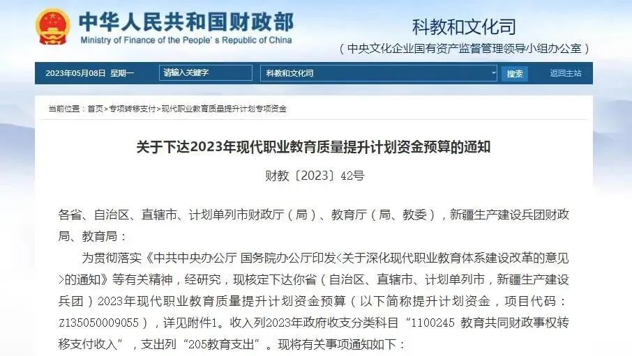 為貫徹落實(shí)《中共中央辦公廳 國(guó)務(wù)院辦公廳印發(fā)<關(guān)于深化現(xiàn)代職業(yè)教育體系建設(shè)改革的意見(jiàn)>的通知》等有關(guān)精神,經(jīng)研究,現(xiàn)核定下達(dá)你省(自治區(qū)、直轄市、計(jì)劃單列市,新疆生產(chǎn)建設(shè)兵團(tuán))2023年現(xiàn)代職業(yè)教育質(zhì)量提升計(jì)劃資金預(yù)算(以下簡(jiǎn)稱(chēng)提升計(jì)劃資金,項(xiàng)目代碼:Z135050009055),詳見(jiàn)附件1。收入列2023年政府收支分類(lèi)科目“1100245 教育共同財(cái)政事權(quán)轉(zhuǎn)移支付收入”,支出列“205教育支出”。現(xiàn)將有關(guān)事項(xiàng)通知如下: