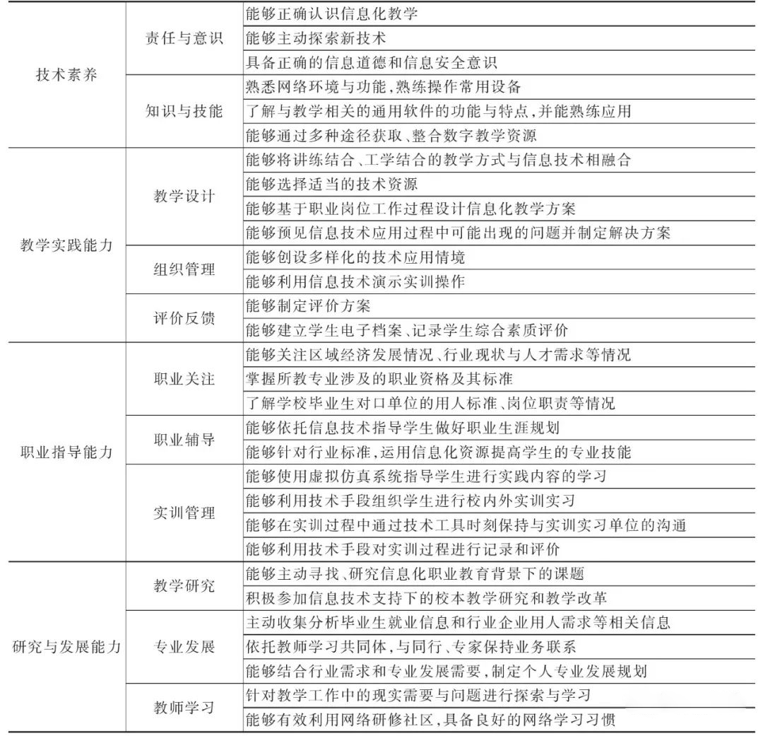 高職教師信息化教學并非信息技術(shù)與教學的簡單相加,而是指教師以促進學生發(fā)展為目的,將信息技術(shù)與教學設(shè)計、教學實施、教學評價等環(huán)節(jié)優(yōu)化整合、融合創(chuàng)新的綜合實踐。高職教師數(shù)字教學能力框架的構(gòu)建應(yīng)以數(shù)字教學能力為核心,體現(xiàn)出職業(yè)教育教學的類型特色。因此,本研究認為高職院校教師信息化教學能力主要由技術(shù)素養(yǎng)、教學實踐能力、職業(yè)指導(dǎo)能力、研究與發(fā)展能力四個要素構(gòu)成(詳見表1)。