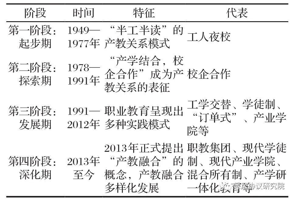 職業(yè)教育的主要目的是培養(yǎng)適合職業(yè)發(fā)展的應(yīng)用型人才,職業(yè)教育的發(fā)展史就是一部不斷尋求與實務(wù)結(jié)合的探索史。學(xué)者根據(jù)不同歷史階段產(chǎn)教關(guān)系呈現(xiàn)出來的表現(xiàn)形式與特征將產(chǎn)教關(guān)系分成四個階段,如表1所示。