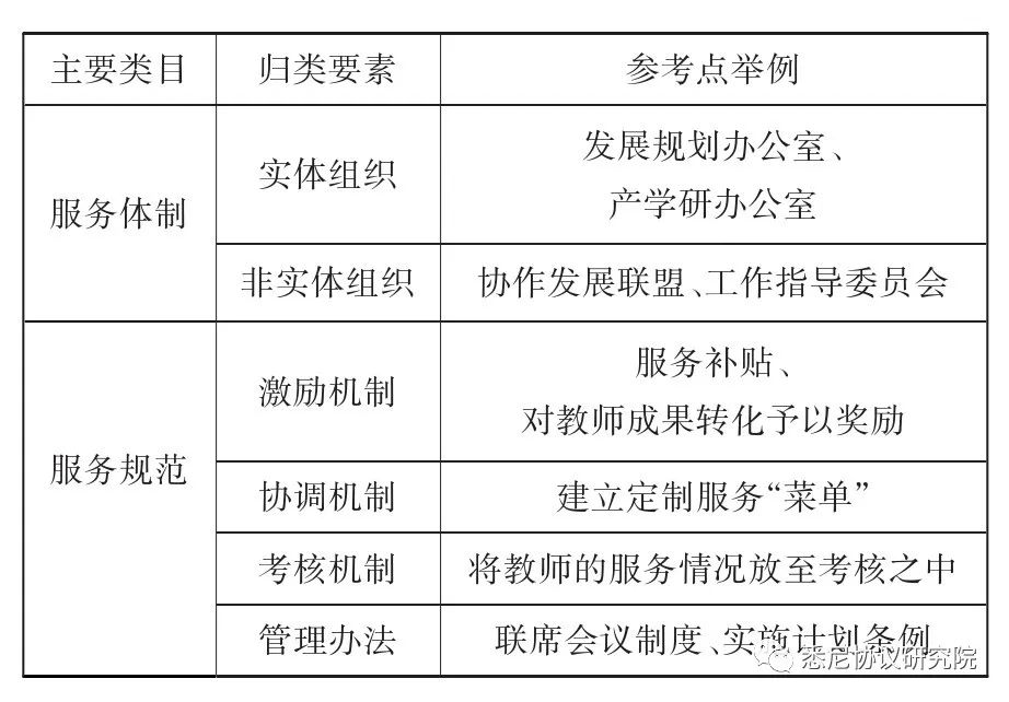 聚焦至本研究中高職院校社會(huì)服務(wù)的要素構(gòu)成,現(xiàn)有研究多基于社會(huì)服務(wù)本身的概念生成展開(kāi)探討,其隨維度的不同各有所差異。例如,從服務(wù)面向的對(duì)象來(lái)看,分為面向行業(yè)、企業(yè)開(kāi)展的技術(shù)服務(wù)、面向有需要的人群開(kāi)展的技術(shù)技能培訓(xùn)、面向當(dāng)?shù)鼐用裉峁┑目破?、文化等方面的?zhuān)業(yè)服務(wù)以及培訓(xùn)服務(wù)、產(chǎn)品加工服務(wù)、技術(shù)開(kāi)發(fā)服務(wù)與決策咨詢(xún)服務(wù);從政策的演變視角來(lái)看,可歸結(jié)為以應(yīng)用技術(shù)服務(wù)企業(yè)生產(chǎn)、新產(chǎn)品開(kāi)發(fā)轉(zhuǎn)化與民間技藝傳承創(chuàng)新、服務(wù)鄉(xiāng)村振興戰(zhàn)略、高技能人才培訓(xùn)與繼續(xù)教育四個(gè)方面;從職業(yè)教育的內(nèi)外環(huán)境來(lái)看,分為機(jī)制模式的創(chuàng)新性、師資隊(duì)伍的適應(yīng)性、專(zhuān)業(yè)建設(shè)的對(duì)接性、人才培養(yǎng)的有效性等內(nèi)生要素與服務(wù)區(qū)域產(chǎn)業(yè)、行業(yè)企業(yè)、人才成長(zhǎng)發(fā)展的外在結(jié)構(gòu)。同時(shí),也有學(xué)者從社會(huì)服務(wù)能力建設(shè)的角度出發(fā),認(rèn)為其是建立有效的機(jī)制體制等,實(shí)現(xiàn)社會(huì)服務(wù)基本要素協(xié)調(diào)的過(guò)程。