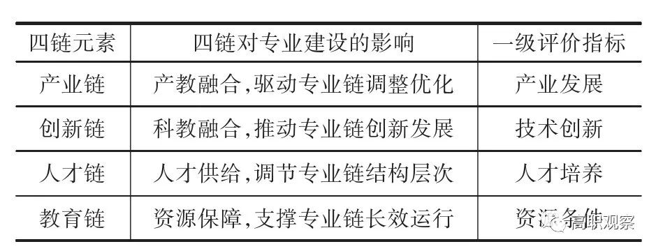 表1 四鏈有效對(duì)接下高職院校專業(yè)評(píng)價(jià)指標(biāo)分析框架