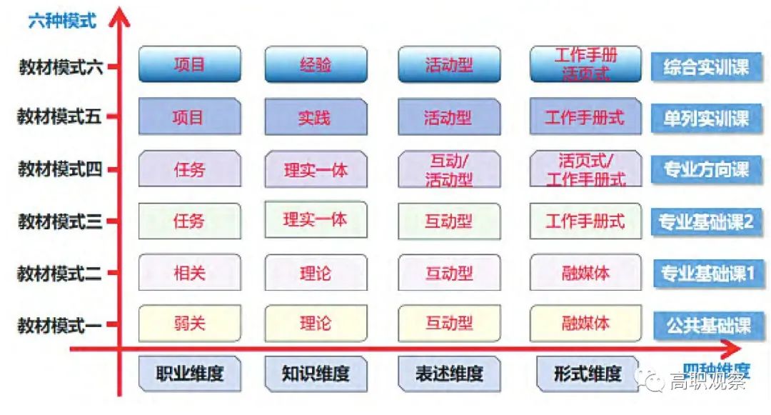 從職業(yè)維度考慮,教材應能體現(xiàn)職業(yè)特點,呼應教材內(nèi)容的職業(yè)性、實用性。根據(jù)教材內(nèi)容與職業(yè)的關聯(lián)度,有弱關、相關、任務和項目等4種類型的教材。弱關類型的教材,其內(nèi)容呈現(xiàn)出與專業(yè)關聯(lián)不大的傳統(tǒng)學科體系和知識邏輯;相關類型的教材,其內(nèi)容仍呈現(xiàn)出知識邏輯,但知識與崗位任務關聯(lián)度較高,是根據(jù)職業(yè)崗位任務精心篩選的、包含職業(yè)元素的更為實用的專業(yè)知識;任務類型的教材,其內(nèi)容以任務為載體,按照生產(chǎn)崗位的標準化任務設計教材的內(nèi)容結(jié)構(gòu),把實際工作任務轉(zhuǎn)化為學習任務;項目類型的教材,按照工程實際項目進行教材內(nèi)容結(jié)構(gòu)設計,教材框架搭設對接實際生產(chǎn)工作過程,崗位任務和相關知識均融入項目實施過程中。
