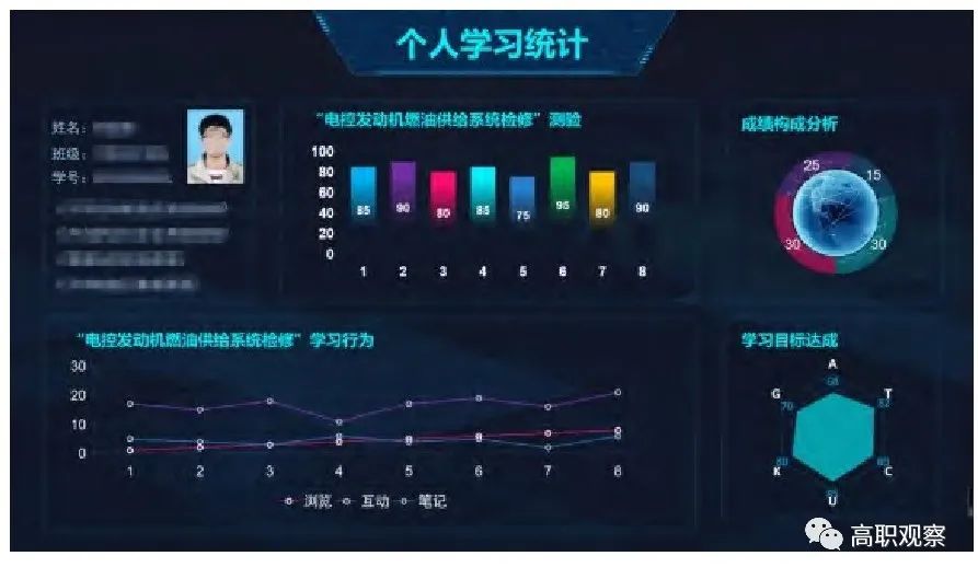 本課程發(fā)揮學(xué)習(xí)平臺的大數(shù)據(jù)統(tǒng)計分析功能,采集學(xué)生學(xué)習(xí)行為數(shù)據(jù),按照“智能統(tǒng)計50%+作品評價30%+總結(jié)考核20%”,以可視化技術(shù)開展精準畫像(圖4),強調(diào)縱向比較,讓每個學(xué)生體驗自己的成長,從而杜絕了“放棄學(xué)”“刷量學(xué)”“雇人學(xué)”等現(xiàn)象,強化了過程性考核和作品評價。對學(xué)生的學(xué)習(xí)行為精準畫像,避免了“模糊分析”“一俊遮百丑”的弊端,促使每個學(xué)生都形成良好的個性,獲得成功體驗。這一評價模式促進了學(xué)生的自我反饋、自我調(diào)控、自我完善、自我認識。
