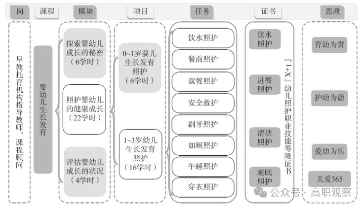某職業(yè)學院早期教育專業(yè)核心課程“嬰幼兒生長發(fā)育”共32學時,在一年級上學期開設,生物學、護理學、教育學等多學科交叉課程。該課程通過講解嬰幼兒成長的過程,幫助學生掌握嬰幼兒生長發(fā)育的基本規(guī)律與保健措施,能夠科學規(guī)范地開展嬰幼兒日常生活照護、保健照護和安全照護等,掌握早教托育教師崗位的必備技能。按照比賽要求,團隊選取模塊二“照護嬰幼兒的健康成長”中的項目二“1~3歲幼兒生長發(fā)育照護”(共16學時)為作品進行參賽。“33653”作品設計是指“3”個重構(gòu)、“365”教學模式、“3”個評價。