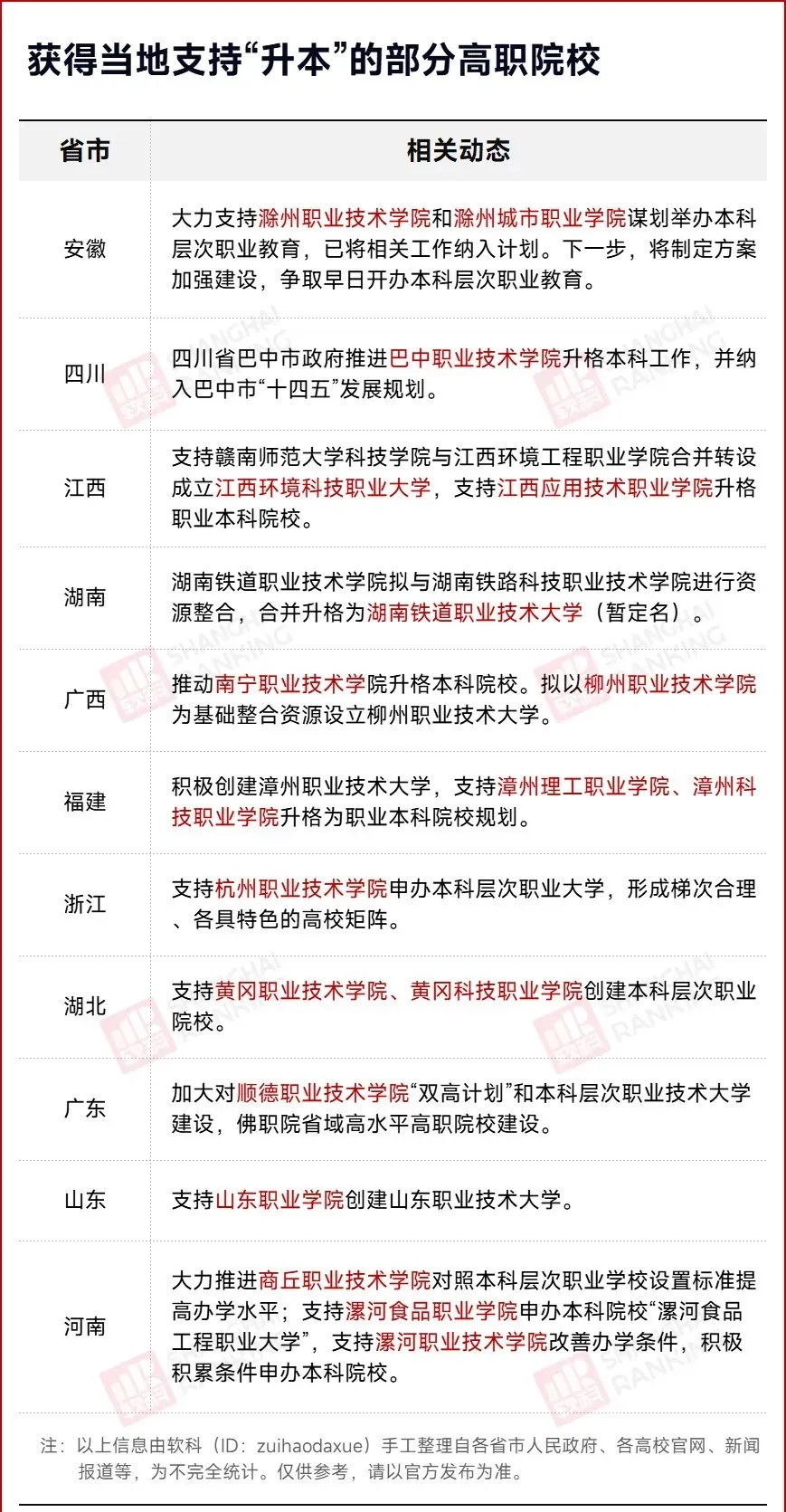 除正式轉(zhuǎn)型的33所職業(yè)院校,與長(zhǎng)春汽車(chē)職業(yè)技術(shù)大學(xué)、四川工程職業(yè)技術(shù)大學(xué)兩所“職本新秀”外,多數(shù)省市在《關(guān)于做好“十四五”時(shí)期高等學(xué)校設(shè)置規(guī)劃編制有關(guān)的通知》中,均將“發(fā)展本科層次職業(yè)學(xué)?!笔乱颂嵘先粘?,給予了政策、資金及人才方面的大力支持,折射出我國(guó)職業(yè)本科教育發(fā)展的廣闊前景。