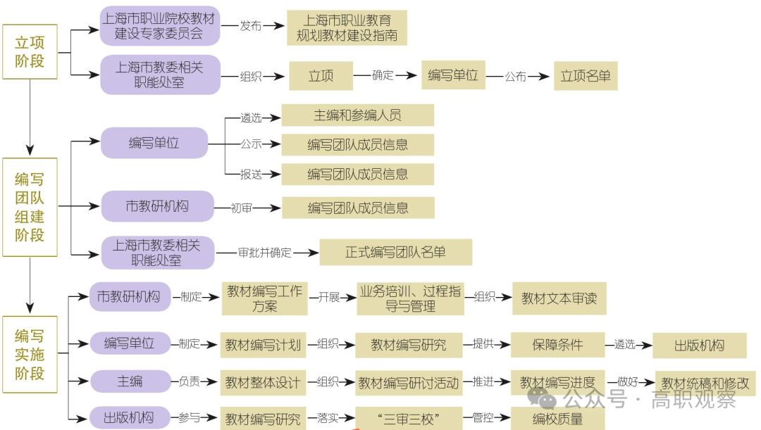 在立項階段,根據(jù)上海市職業(yè)院校教材建設(shè)專家委員會發(fā)布的規(guī)劃教材建設(shè)指南,由教育行政部門相關(guān)職能處室組織立項、確定編寫單位并公布立項名單。在編寫團隊組建環(huán)節(jié),由編寫單位遴選符合要求的主編和參編人員,按要求向社會公示并將編寫團隊信息報送市教研機構(gòu),市教研機構(gòu)做好編寫團隊信息初審工作,并報送職能處室審批后確定編寫團隊名單。在編寫實施階段,市教研機構(gòu)制定教材編寫工作方案,明確目標(biāo)、任務(wù)、進度以及質(zhì)量要求,開展業(yè)務(wù)培訓(xùn)、過程指導(dǎo)與管理,組織教材文本審讀;編寫單位根據(jù)要求制定教材編寫計劃,組織開展教材編寫研究,提供教材編寫所需的相應(yīng)保障條件,按要求遴選出版機構(gòu);主編做好教材整體設(shè)計,組織編寫研討活動,推進教材編寫進度,做好教材統(tǒng)稿和修改,把握編寫質(zhì)量;出版機構(gòu)積極參與教材編寫研究,按規(guī)定做好排版編輯和審校工作,嚴格落實“三審三?!保WC編校質(zhì)量。