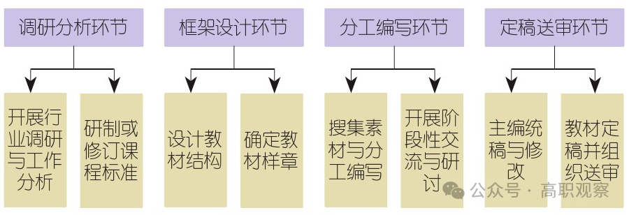 第一,調(diào)研分析環(huán)節(jié),編寫團隊需要深入開展行業(yè)調(diào)研,把握相應(yīng)崗位需求和技術(shù)發(fā)展趨勢,組織開展典型工作任務(wù)與職業(yè)能力分析,研制或完善對應(yīng)課程標(biāo)準,確立教材編寫的基本依據(jù)。第二,框架設(shè)計環(huán)節(jié),主編組織制定教材編寫方案,提出教材編寫的整體思路,組織編寫團隊研討確定教材的縱向結(jié)構(gòu)和橫向結(jié)構(gòu),設(shè)計教材樣章,確定編寫人員分工與進度安排。第三,分工編寫環(huán)節(jié),團隊成員根據(jù)分工搜集相應(yīng)的資源與素材,分頭開展教材編寫,過程中根據(jù)進展情況開展必要的交流與研討。第四,定稿送審環(huán)節(jié),由主編親自組織統(tǒng)稿,并將修改意見反饋給參編人員,修改完成后經(jīng)專家審讀和出版機構(gòu)“三審三?!?,確定教材定稿,再按相應(yīng)要求組織教材送審。