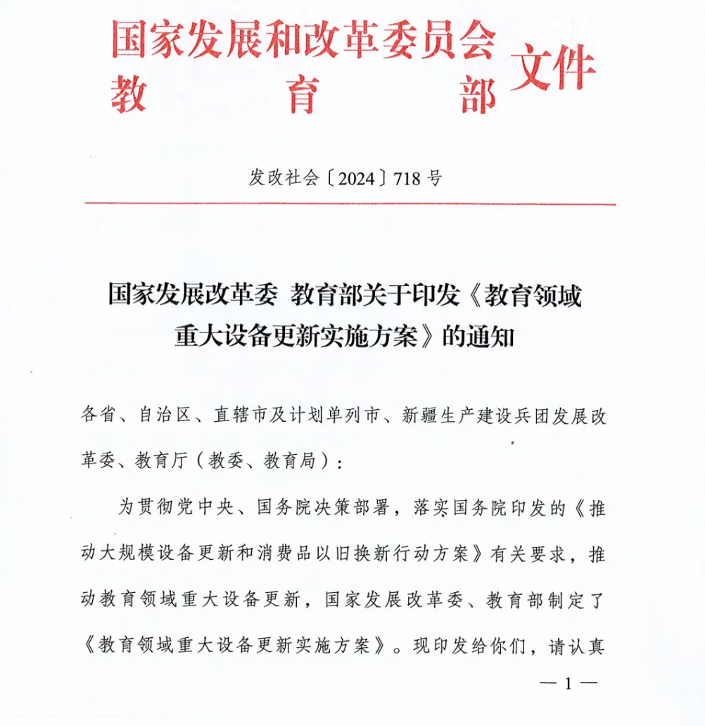 推動教育領(lǐng)域重大設(shè)備更新,國家發(fā)改委、教育部制定并印發(fā)《教育領(lǐng)域重大設(shè)備更新實施方案》。