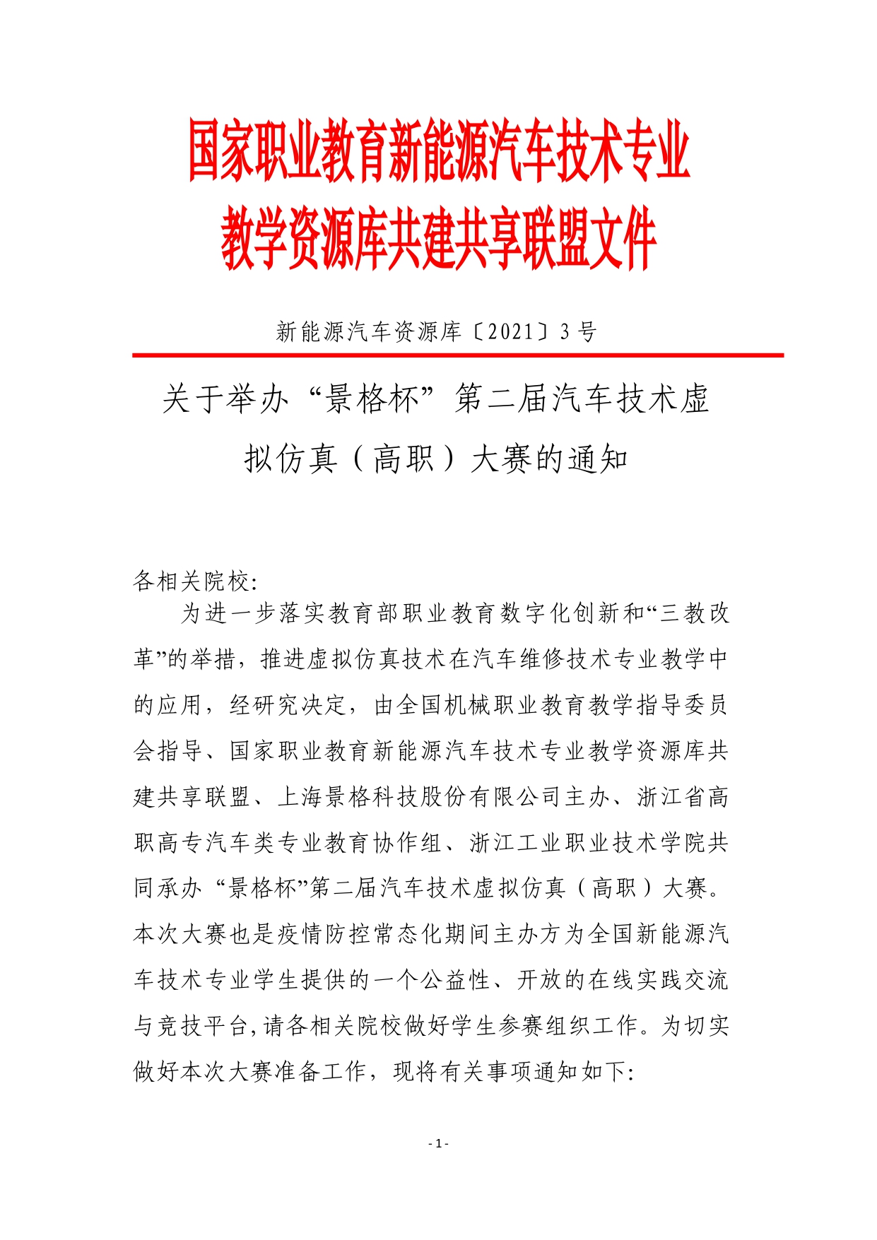 為進(jìn)一步落實(shí)教育部職業(yè)教育數(shù)字化創(chuàng)新和“三教改 革”的舉措,推進(jìn)虛擬仿真技術(shù)在汽車維修技術(shù)專業(yè)教學(xué)中 的應(yīng)用,經(jīng)研究決定,由全國機(jī)械職業(yè)教育教學(xué)指導(dǎo)委員 會(huì)指導(dǎo)、國家職業(yè)教育新能源汽車技術(shù)專業(yè)教學(xué)資源庫共建共享聯(lián)盟、上海景格科技股份有限公司主辦、浙江省高職高專汽車類專業(yè)教育協(xié)作組...