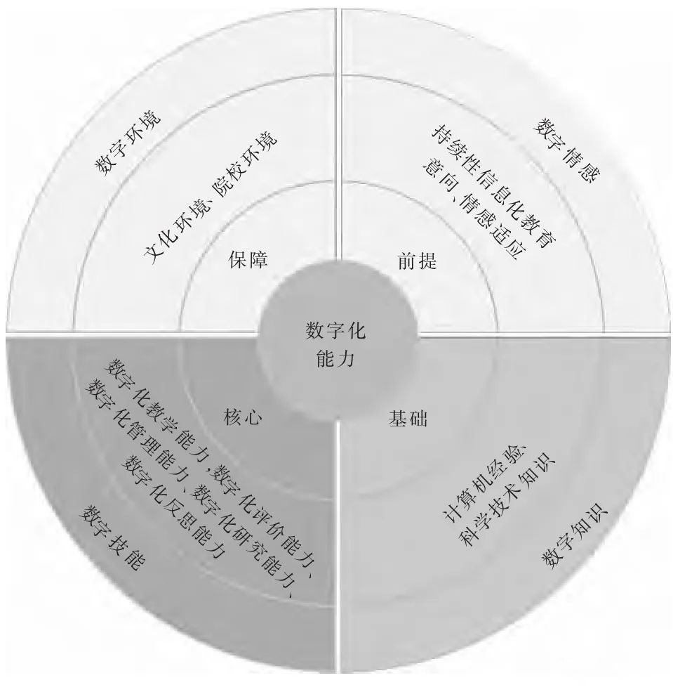 結(jié)合國內(nèi)外已有研究可知,職業(yè)院校教師數(shù)字化能力是指職業(yè)院校教師所具備的運用信息化技術(shù)進行教學、教研、反思時所涉及的數(shù)字情感、數(shù)字知識、數(shù)字技能與數(shù)字環(huán)境的心理特質(zhì)。